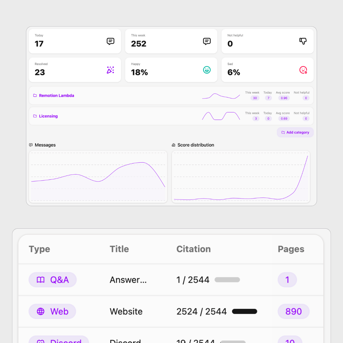 CrawlChat provides a lot of useful information about your docs and questions being asked by your users. You can see the daily messages, score distribution, data gaps, hot knowledge pages, categories, sentiment analysis and more.